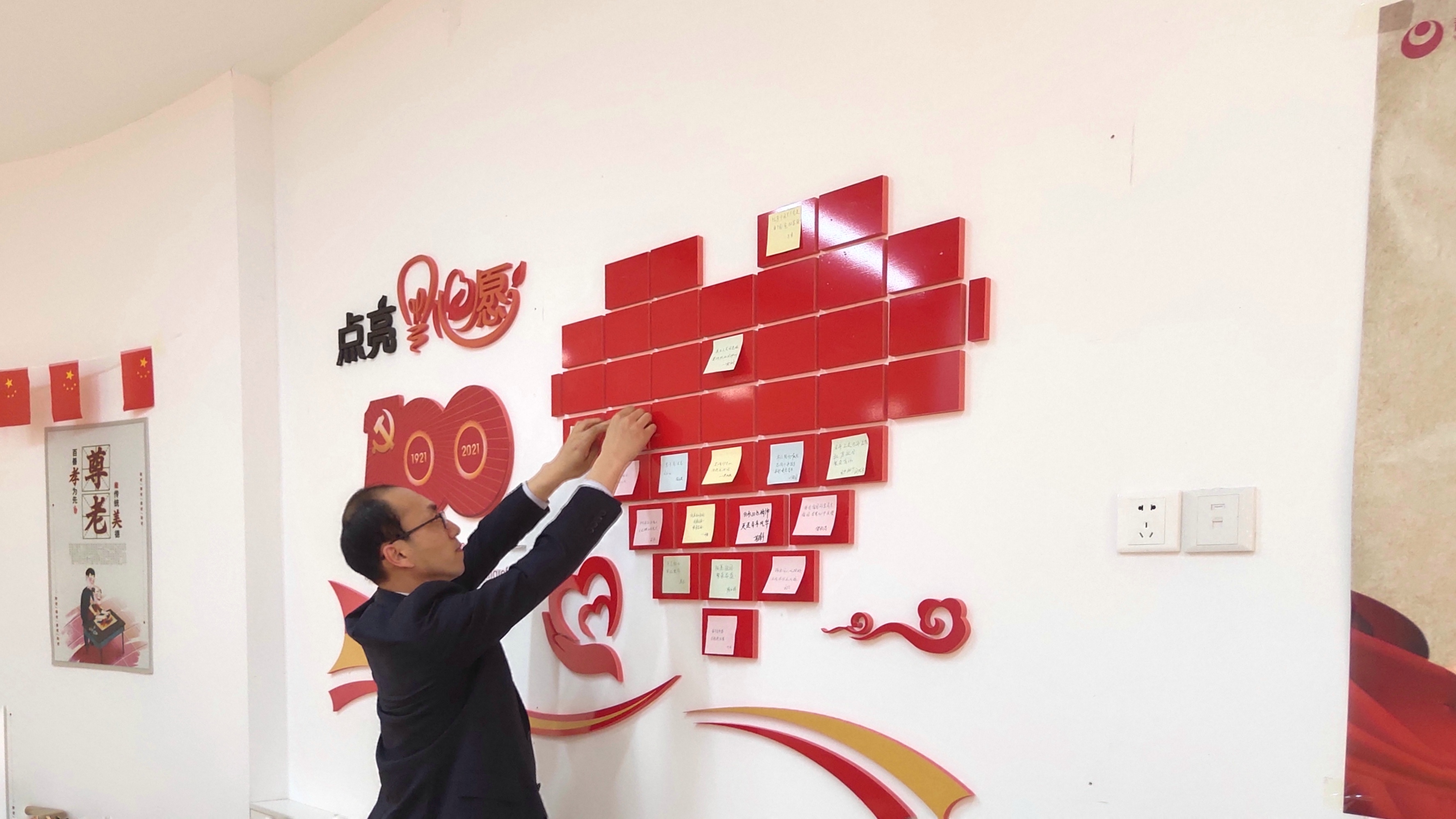 隨后,大家來到建黨百年心愿墻前,在心愿卡上一字一句地寫下對黨的祝福期盼和美好愿景,并親手貼上,表達對黨、對祖國的熱愛之情。
